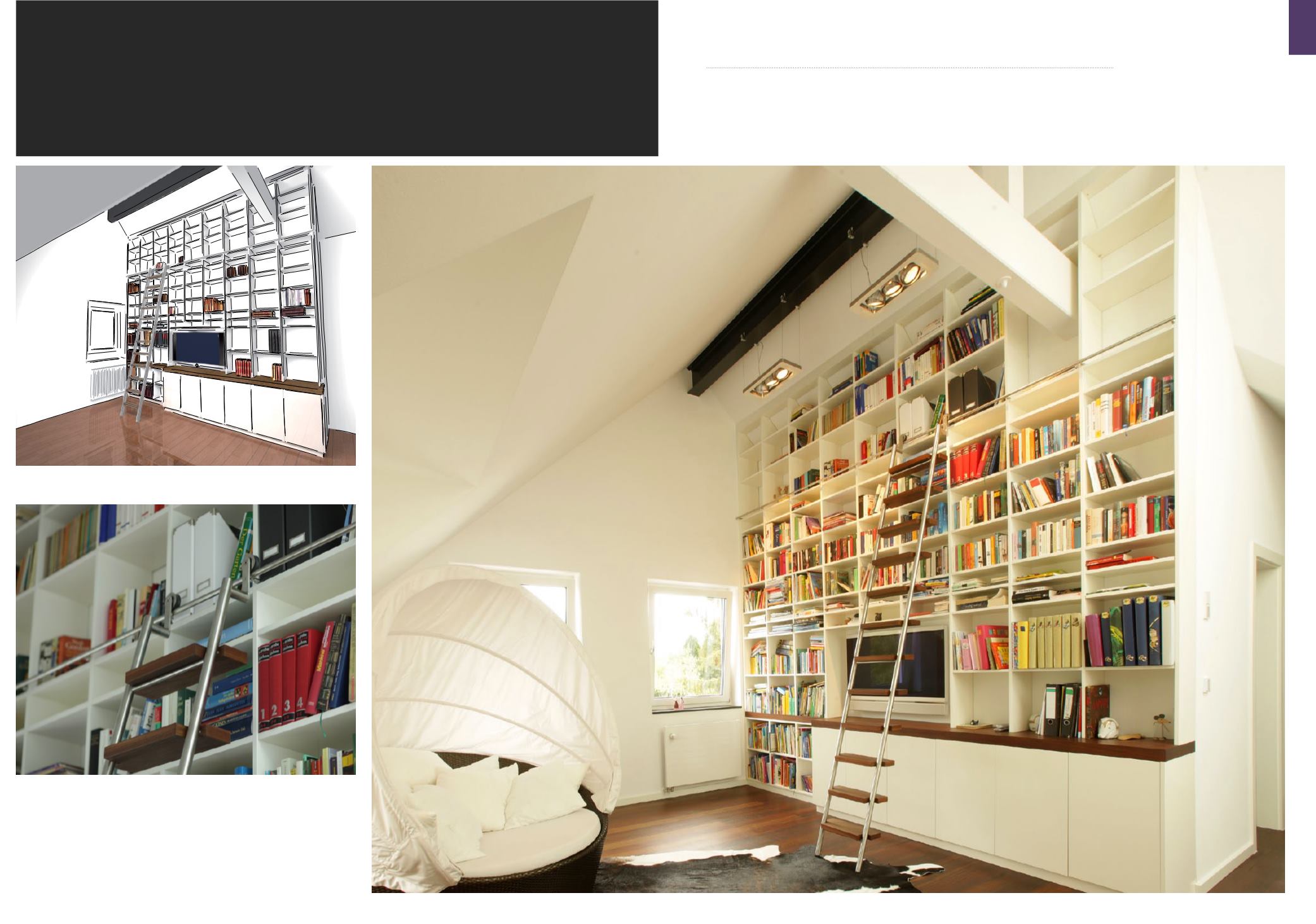 die integrierte Führungsschiene an der Bücherwand entlang